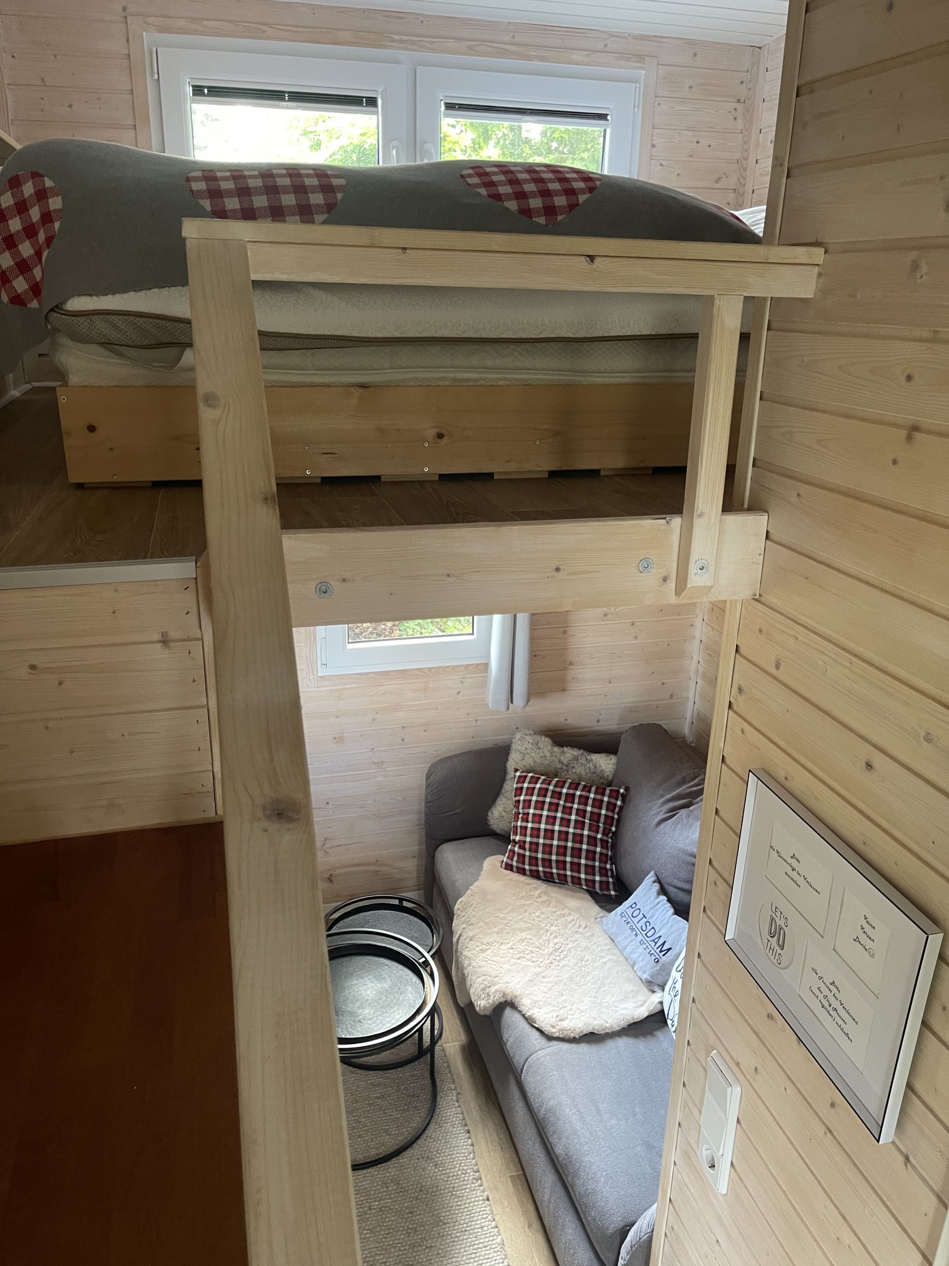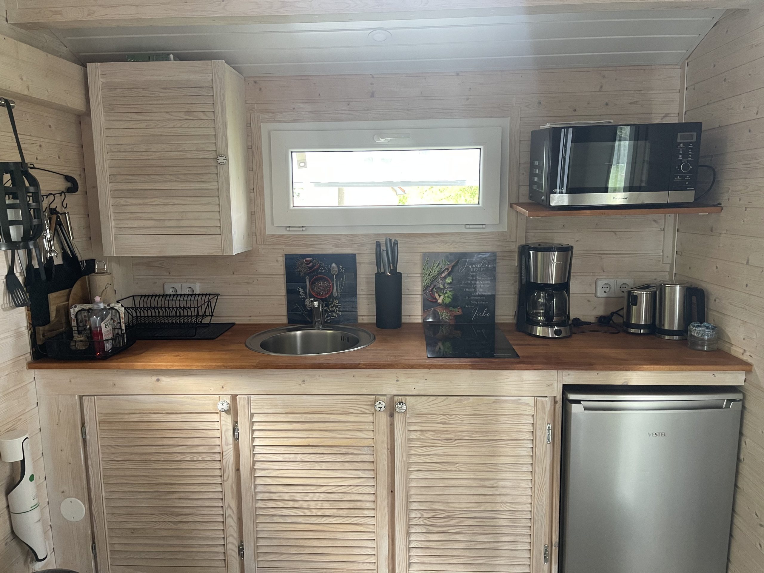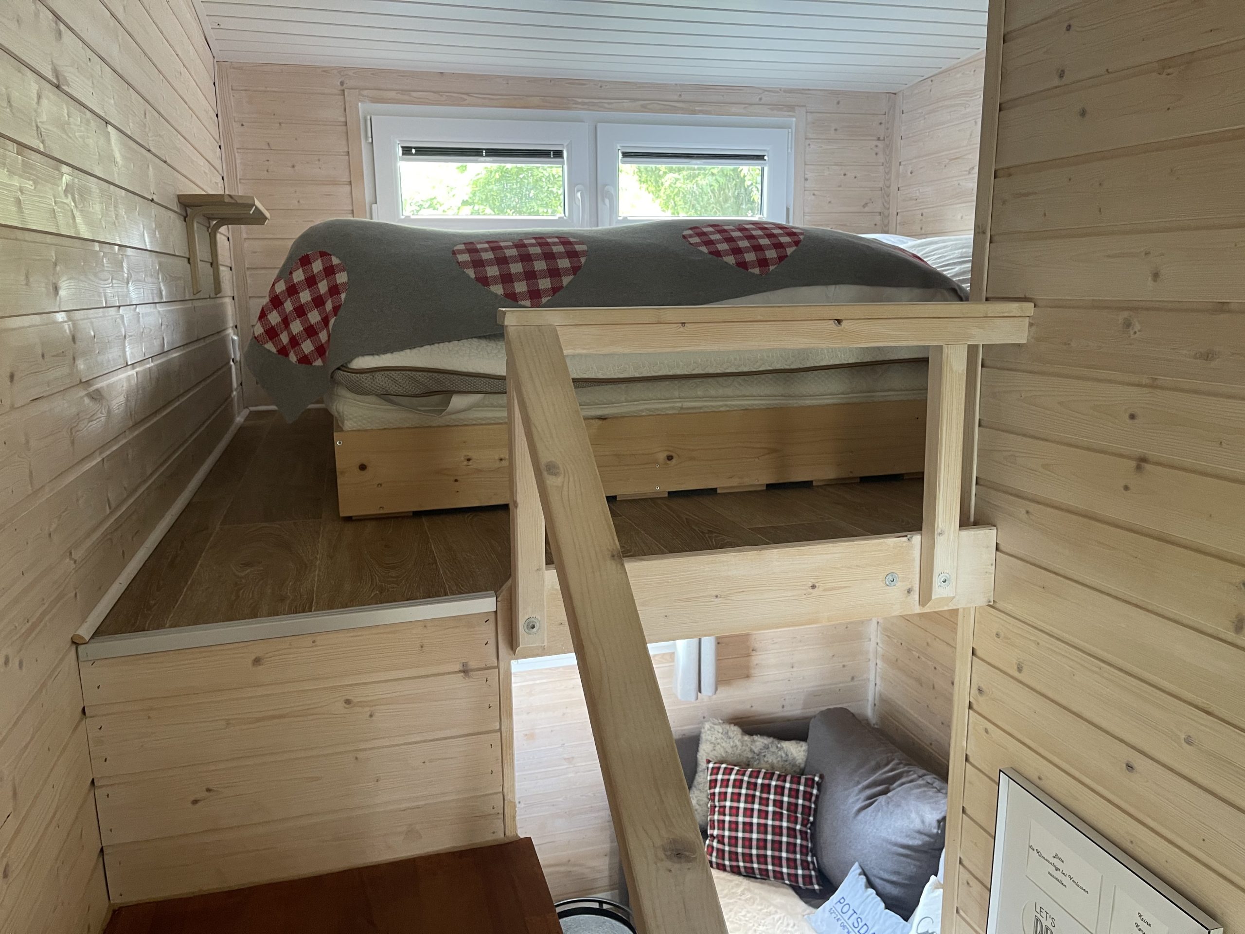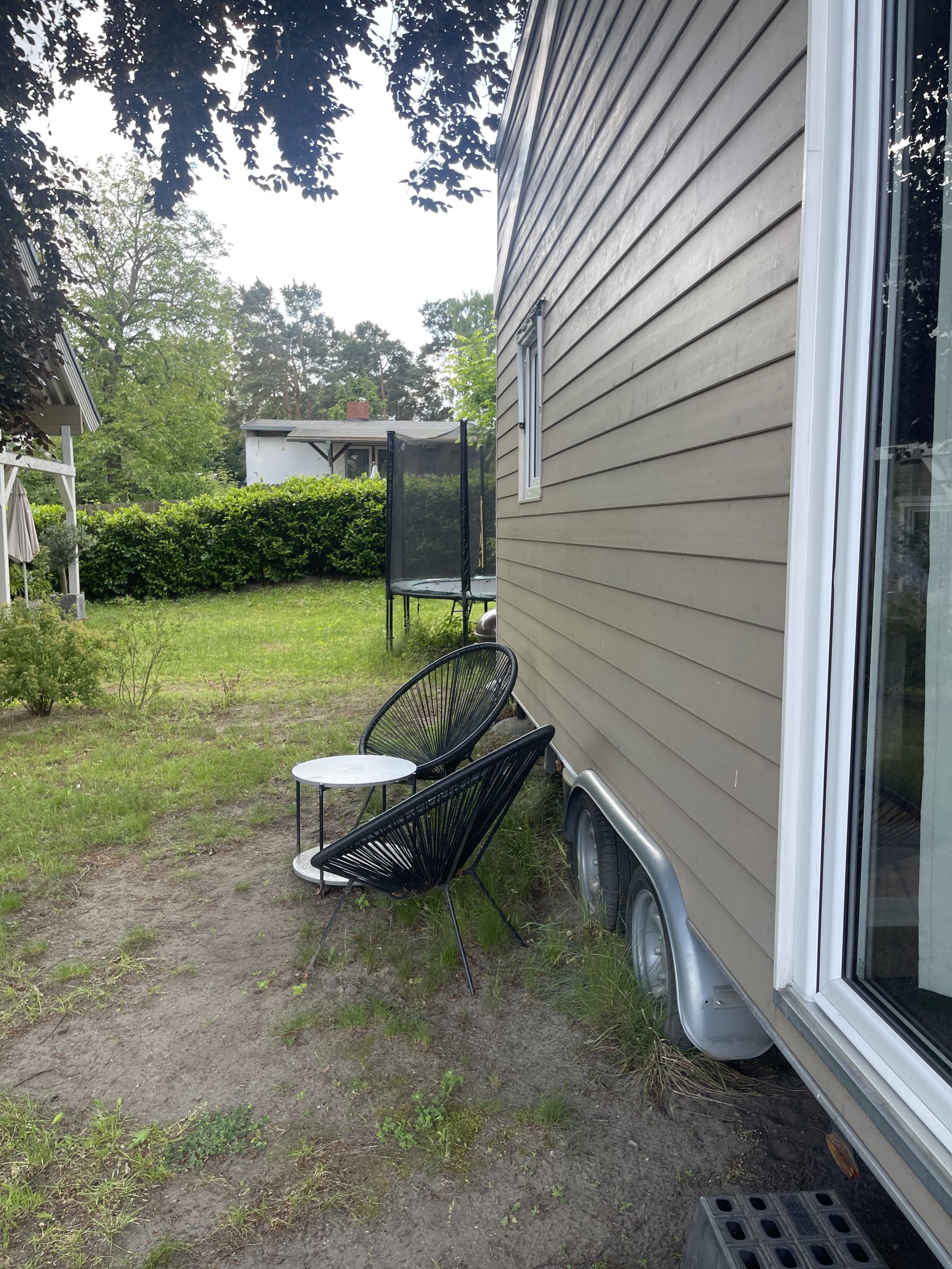 Potsdam-Gross Glienicke. Ein kleiner schöner Ort direkt am ehemaligen Mauerstreifen zwischen Ost und West, am Stadtrand von Berlin und unweit der wunderschönen Residenzstadt Potsdam. Der Ort hat 2 Seen und viel Natur. Das kleine Häuschen steht auf dem Grundstück des Chalets Rotbuche mit eigenem Eingang. Das Tiny verfügt über eine Wohnzimmerecke mit gemütlicher Coach zum Ausziehen , eine Küchenecke mit Sitzmöbeln, ein modernes Bad mit Dusche und einer Schlafempore mit einem Doppelbett ( 1,60) und einem Einzelbett ( 0,80×2,00). Es hat jeglichen Komfort und komplette Ausstattung vom Kühlschrank über Kaffeemaschine bis zum TV Gerät, WLAN und natürlich auch Heizung bzw. Klimaanlage. Das Haus strahlt Behaglichkeit und ein Wohlfühlambiente aus, nicht zuletzt durch das Holz in warmen Weiss gekälkt. Bitte beachten Sie, dass das Tiny zwar optisch getrennten Wohn- und Schlafbereich hat, aber das diese im Haus nicht durch Türen getrennt sind . Zur Schlafempore führt eine Treppe, daher nicht für mobilitätseingeschränkte Personen geeignet.