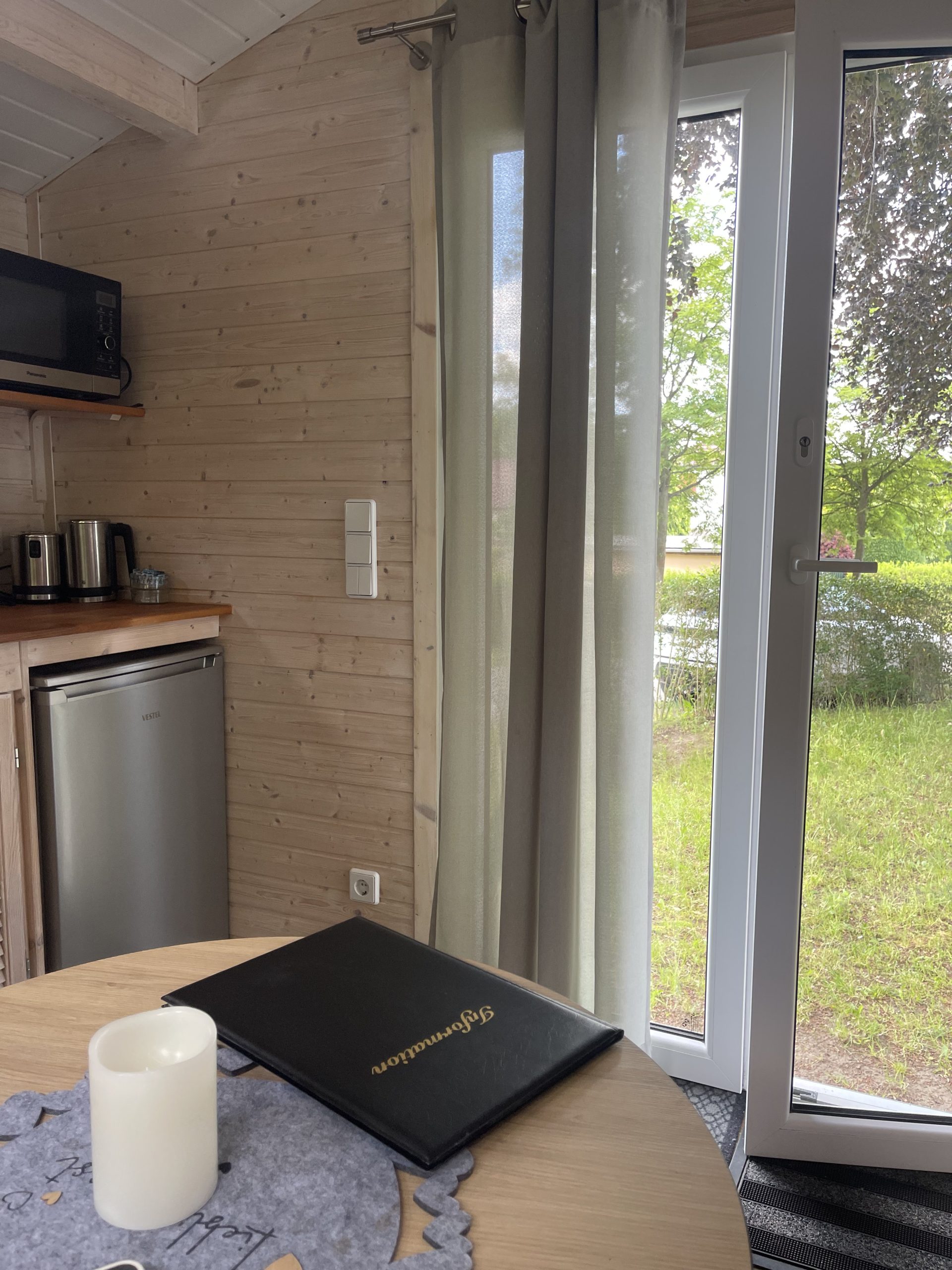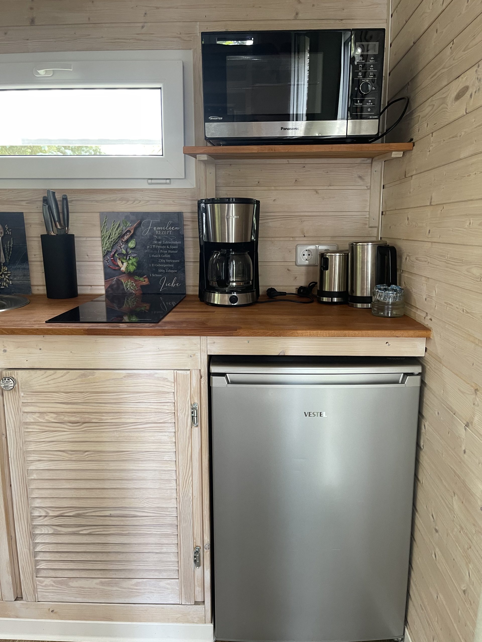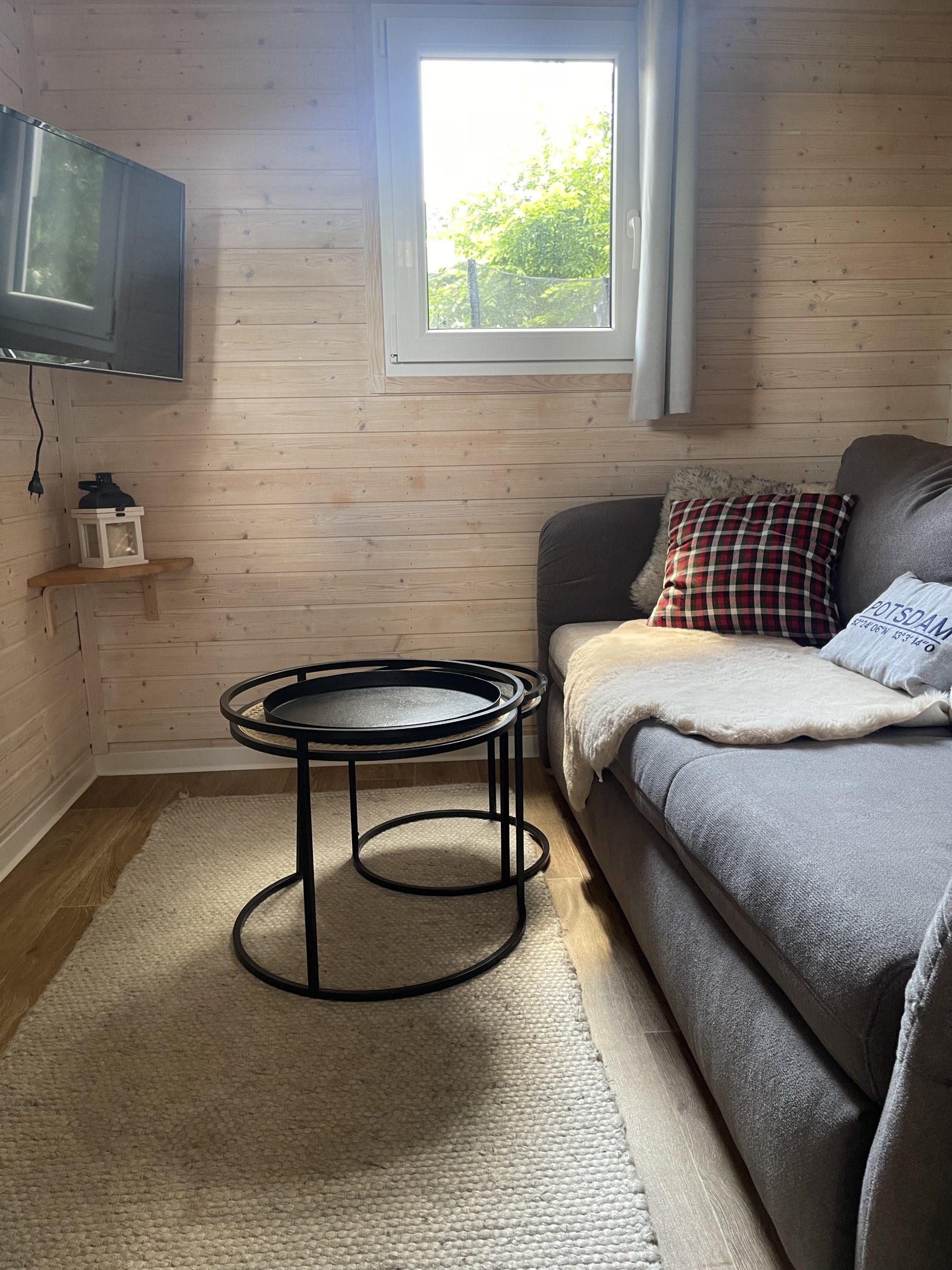 Potsdam-Gross Glienicke. Ein kleiner schöner Ort direkt am ehemaligen Mauerstreifen zwischen Ost und West, am Stadtrand von Berlin und unweit der wunderschönen Residenzstadt Potsdam. Der Ort hat 2 Seen und viel Natur. Das kleine Häuschen steht auf dem Grundstück des Chalets Rotbuche mit eigenem Eingang. Das Tiny verfügt über eine Wohnzimmerecke mit gemütlicher Coach zum Ausziehen , eine Küchenecke mit Sitzmöbeln, ein modernes Bad mit Dusche und einer Schlafempore mit einem Doppelbett ( 1,60) und einem Einzelbett ( 0,80×2,00). Es hat jeglichen Komfort und komplette Ausstattung vom Kühlschrank über Kaffeemaschine bis zum TV Gerät, WLAN und natürlich auch Heizung bzw. Klimaanlage. Das Haus strahlt Behaglichkeit und ein Wohlfühlambiente aus, nicht zuletzt durch das Holz in warmen Weiss gekälkt. Bitte beachten Sie, dass das Tiny zwar optisch getrennten Wohn- und Schlafbereich hat, aber das diese im Haus nicht durch Türen getrennt sind . Zur Schlafempore führt eine Treppe, daher nicht für mobilitätseingeschränkte Personen geeignet.