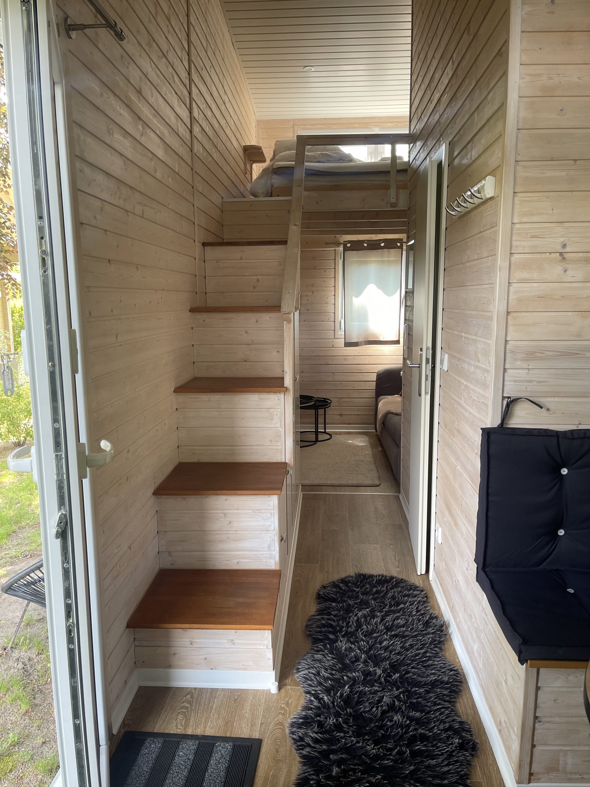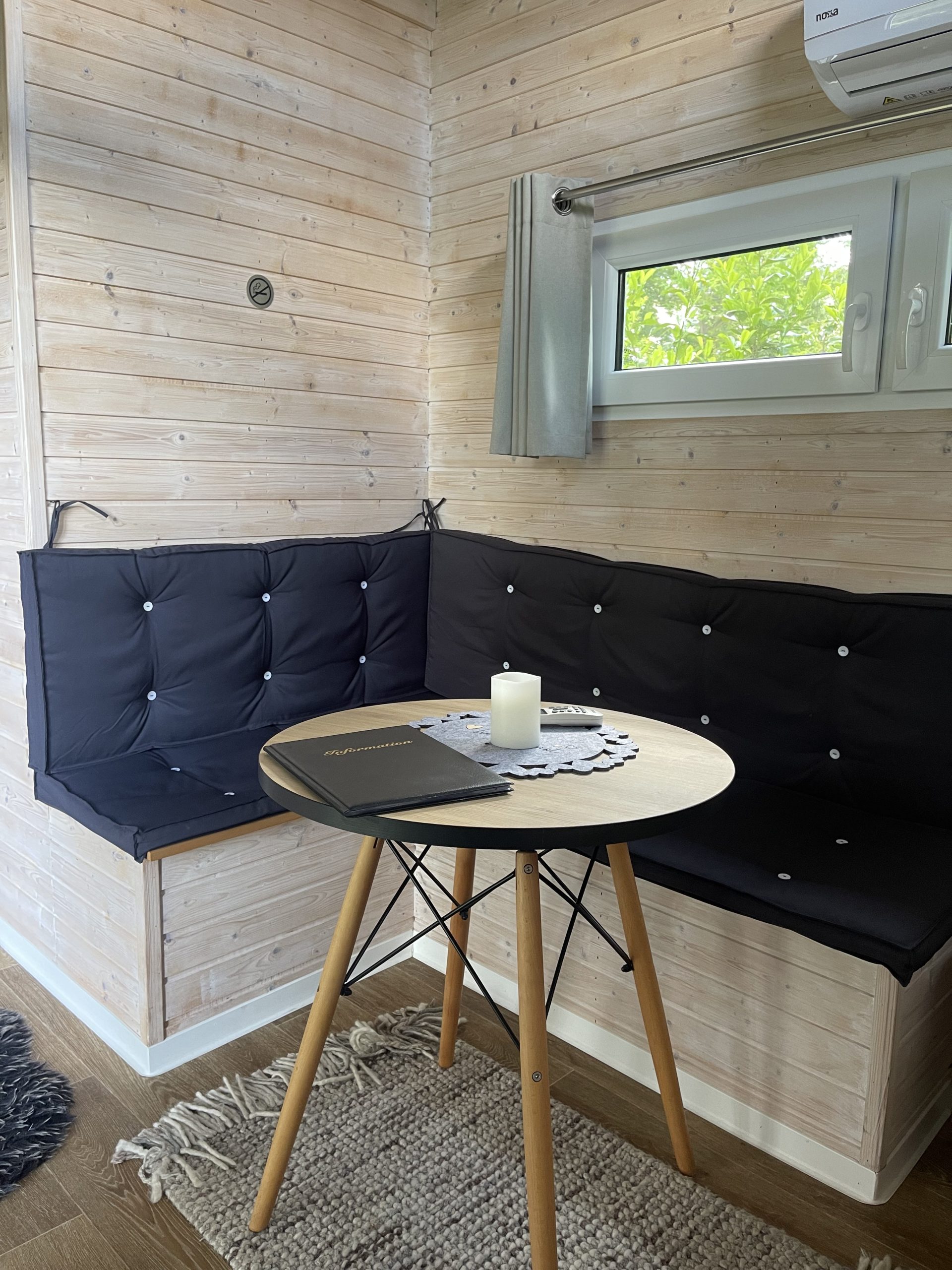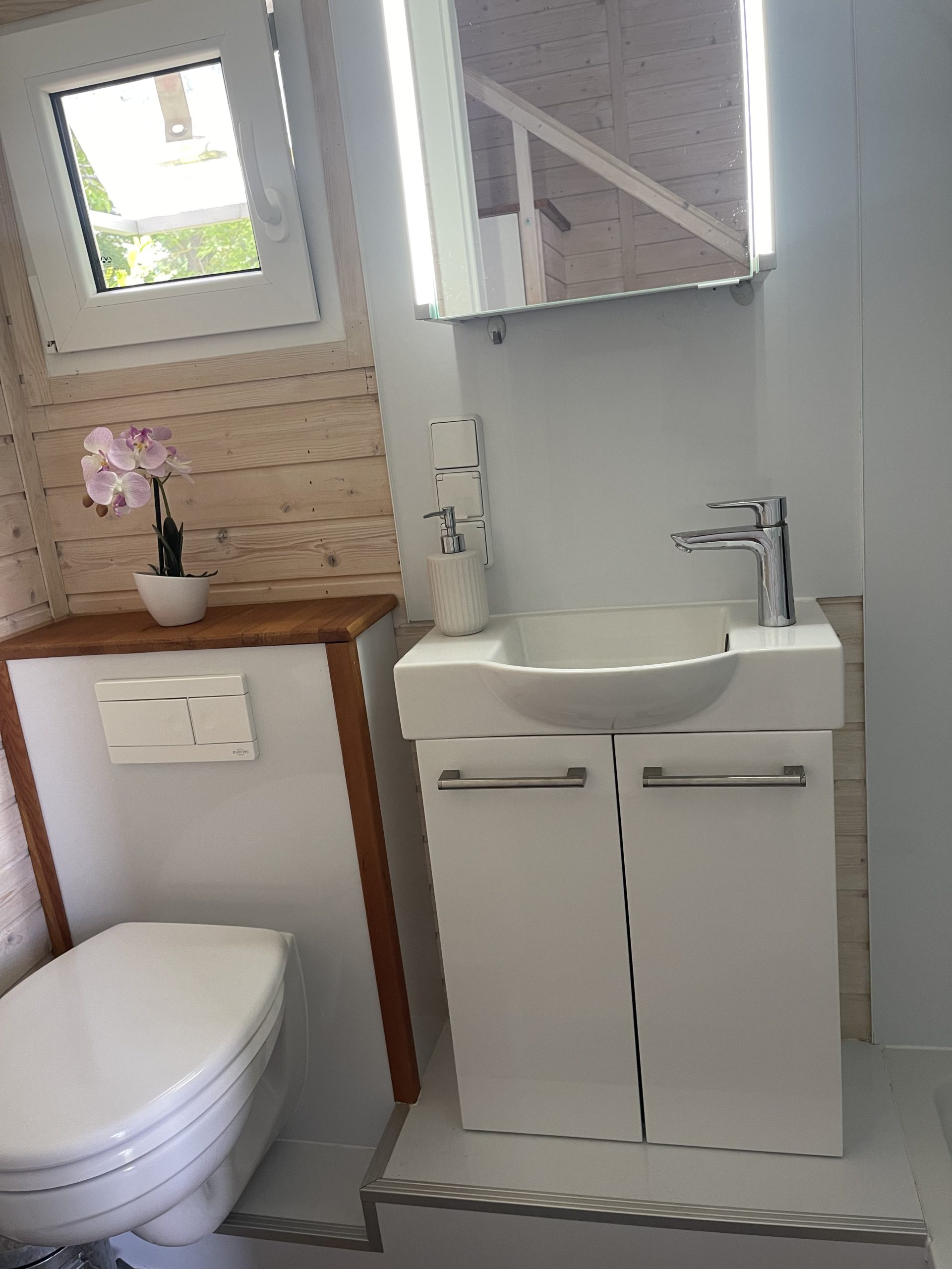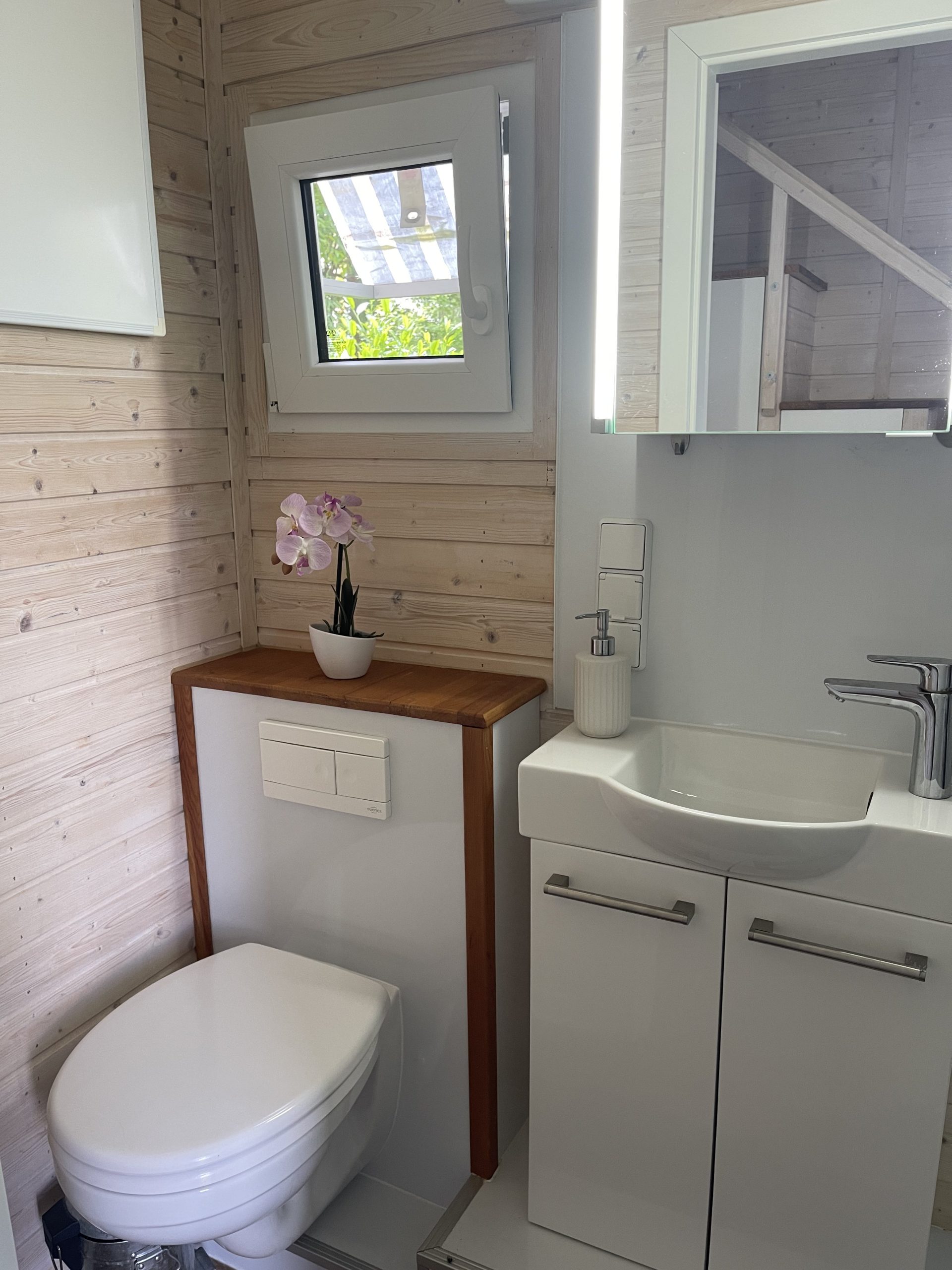 Potsdam-Gross Glienicke. Ein kleiner schöner Ort direkt am ehemaligen Mauerstreifen zwischen Ost und West, am Stadtrand von Berlin und unweit der wunderschönen Residenzstadt Potsdam. Der Ort hat 2 Seen und viel Natur. Das kleine Häuschen steht auf dem Grundstück des Chalets Rotbuche mit eigenem Eingang. Das Tiny verfügt über eine Wohnzimmerecke mit gemütlicher Coach zum Ausziehen , eine Küchenecke mit Sitzmöbeln, ein modernes Bad mit Dusche und einer Schlafempore mit einem Doppelbett ( 1,60) und einem Einzelbett ( 0,80×2,00). Es hat jeglichen Komfort und komplette Ausstattung vom Kühlschrank über Kaffeemaschine bis zum TV Gerät, WLAN und natürlich auch Heizung bzw. Klimaanlage. Das Haus strahlt Behaglichkeit und ein Wohlfühlambiente aus, nicht zuletzt durch das Holz in warmen Weiss gekälkt. Bitte beachten Sie, dass das Tiny zwar optisch getrennten Wohn- und Schlafbereich hat, aber das diese im Haus nicht durch Türen getrennt sind . Zur Schlafempore führt eine Treppe, daher nicht für mobilitätseingeschränkte Personen geeignet.